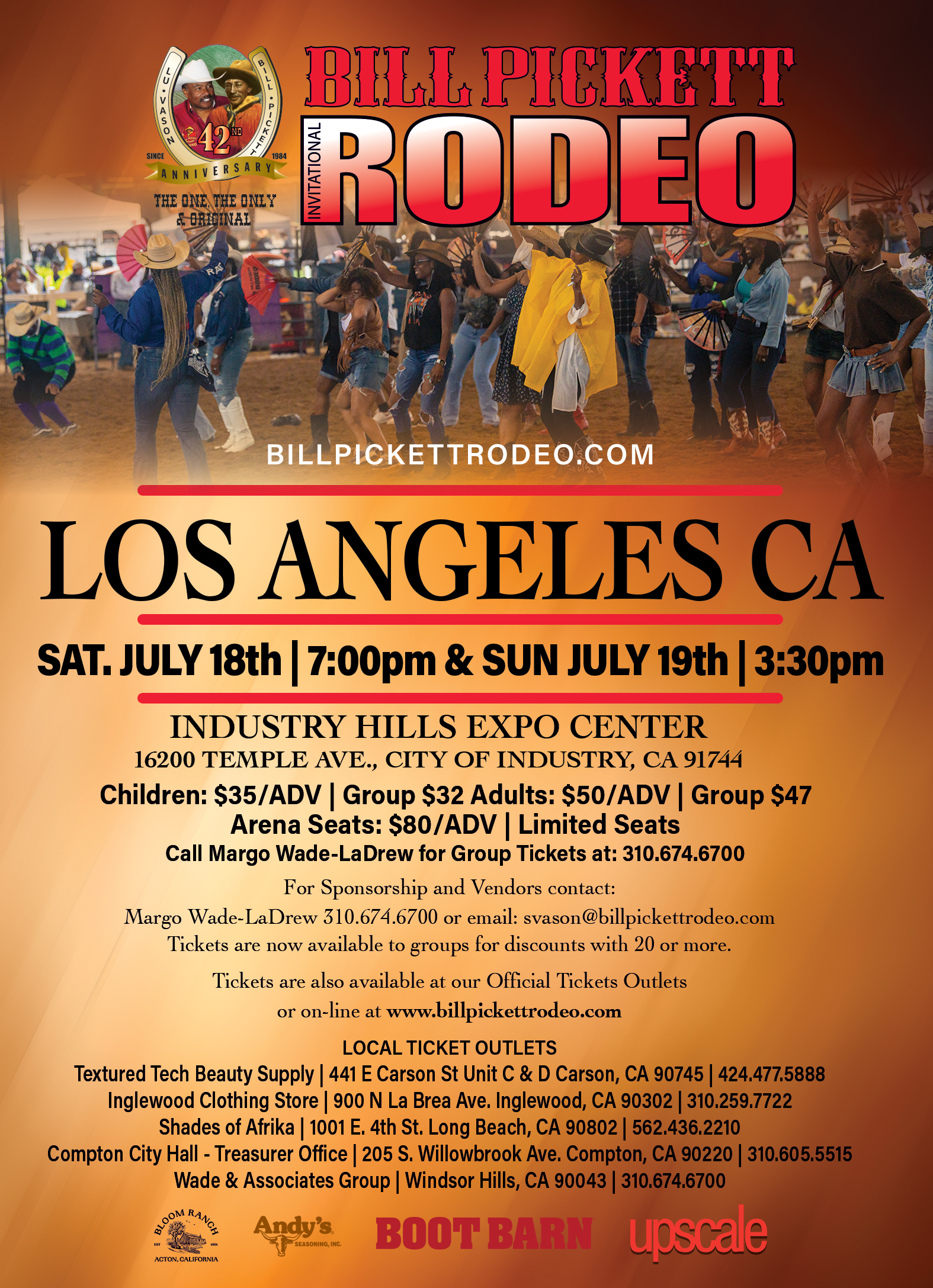 Call 310.674.6700, Wade & Associates Group Outlet to purchase tickets.
